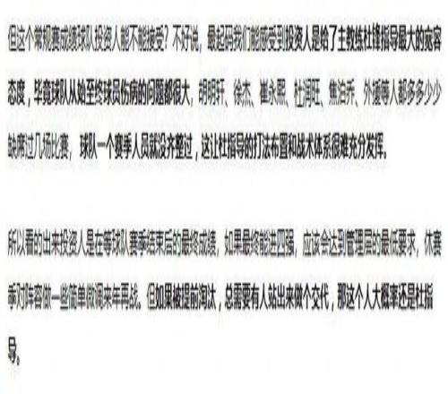 对于广东男篮的成绩,“海jun的蓝”表示投资人肯定是有要求的,目前可以说是给了主教练杜锋指导最大的宽容态度。投资人是在等球队赛季结束后的最终成绩,如果最终能进四强,应该会达到管理层的最低要求,休赛季对阵容做一些简单微调来年再战。但如果被提前淘汰,总需要有人站出来做个交代,那这个人大概率还是杜指导。“海jun的蓝”虽然说的非常隐晦,但意思却非常明显,那就是广东男篮如果能够在季后赛中打进四强还好说,如果打不进四强的话,杜锋就有下课的可能了。